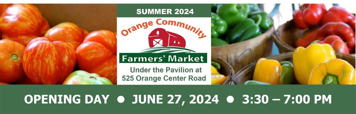 Discover local delights at Orange Community Farmers Market every Thursday, June 27 - Sept 26, 2024, at 525 Orange Center Rd. Enjoy fresh veggies, homemade treats, artisan crafts, and more from 3:30-7:00 pm!